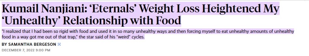 Issues surrounding media depictions of eating disorders and how the general public perceive them are also not helped by the general diet culture prevalent within western cultures where fatphobia and the pursuit of thinness are things that are not only normalised, but are praised in most instances. And we cannot talk about diet culture without talking about gym culture and how that relates to the current media landscape, namely superhero films. It’s become normalised that whenever an actor gets cast in a superhero films they undergo a dramatic physical transformation to become “ripped”– Chris Hemsworth for Thor, Chris Pratt for Guardians of the Galaxy, Kumail Nanjiani for The Eternals and so many more– and because we equate someone looking muscular with health, this is something that is celebrated. But for anyone at all familiar with gym culture you’d know that the behaviours required to achieve and maintain such a physique, namely the obsessive tracking of calories, and macro and micro-nutrients, to ensure you’re in a calorie deficit and consume a specific amount of protein, the process of “bulking” and “cutting”, aren’t all that much different to the behaviours I’ve described already associated with eating disorders. In fact these behaviours are so akin to disordered eating that there is emerging research to come up with proposed diagnostic criteria for a new eating disorder termed “Orthorexia Nervosa” focused on individuals that have an obsessive focus on “healthy” and “clean” eating.
